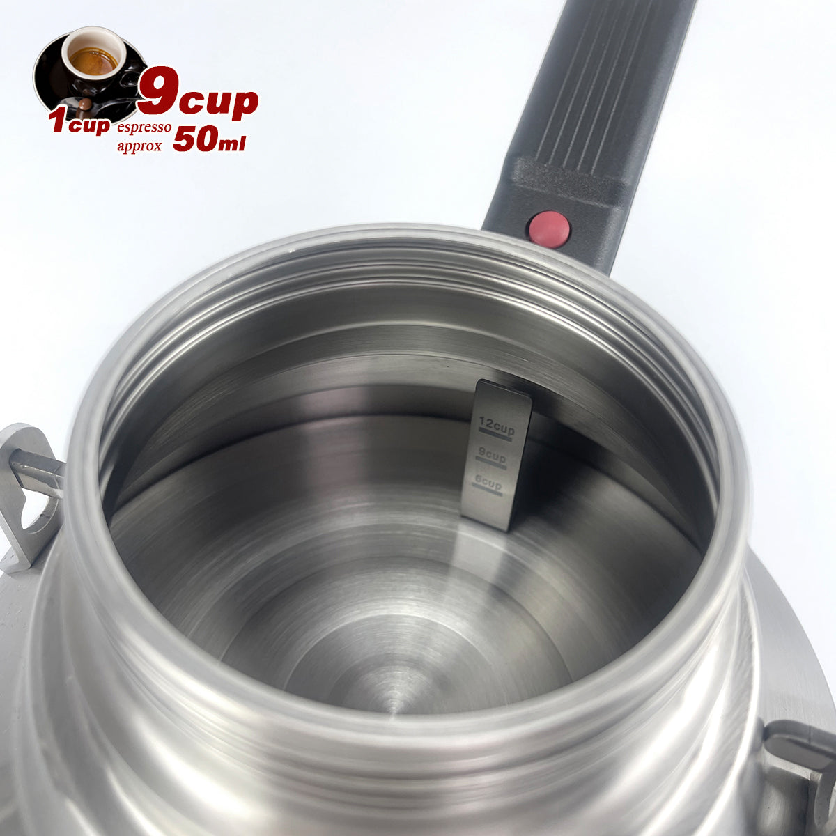 Large Capacity - Suitable for family use - Camping 2-in-1 Mocha coffee maker has a large capacity and can brew 9 cups (about 450 ml) of authentic espresso at one time. As a kettle, it can brew 12 cups of water (about 600 ml) at one time.