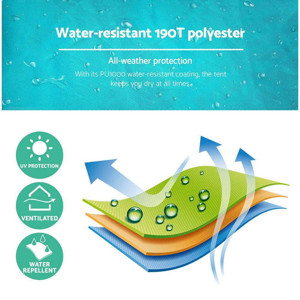 With ample room for three people, the pop-up tent features a heavy-duty 190T PU material construction with water and UV resistance and has a silver-coated interior that provides more light and reduces heat accumulation.