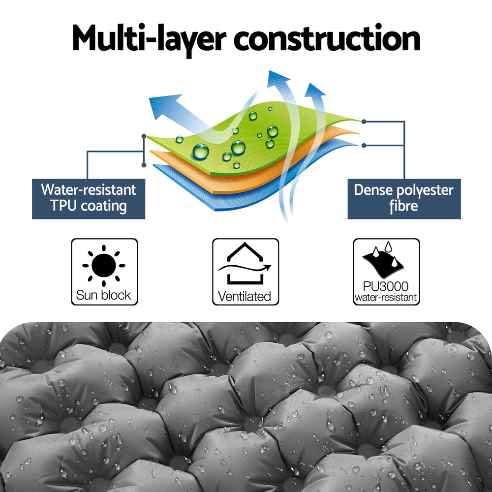 9cm thickness mat with pillow is comfortable to sit and lie on during your trip. When you're finished, simply roll up your mat and put it in the provided carry bag for easy transportation and storage. Ideal for camping all year round. Get yours today. Camp Your Way!