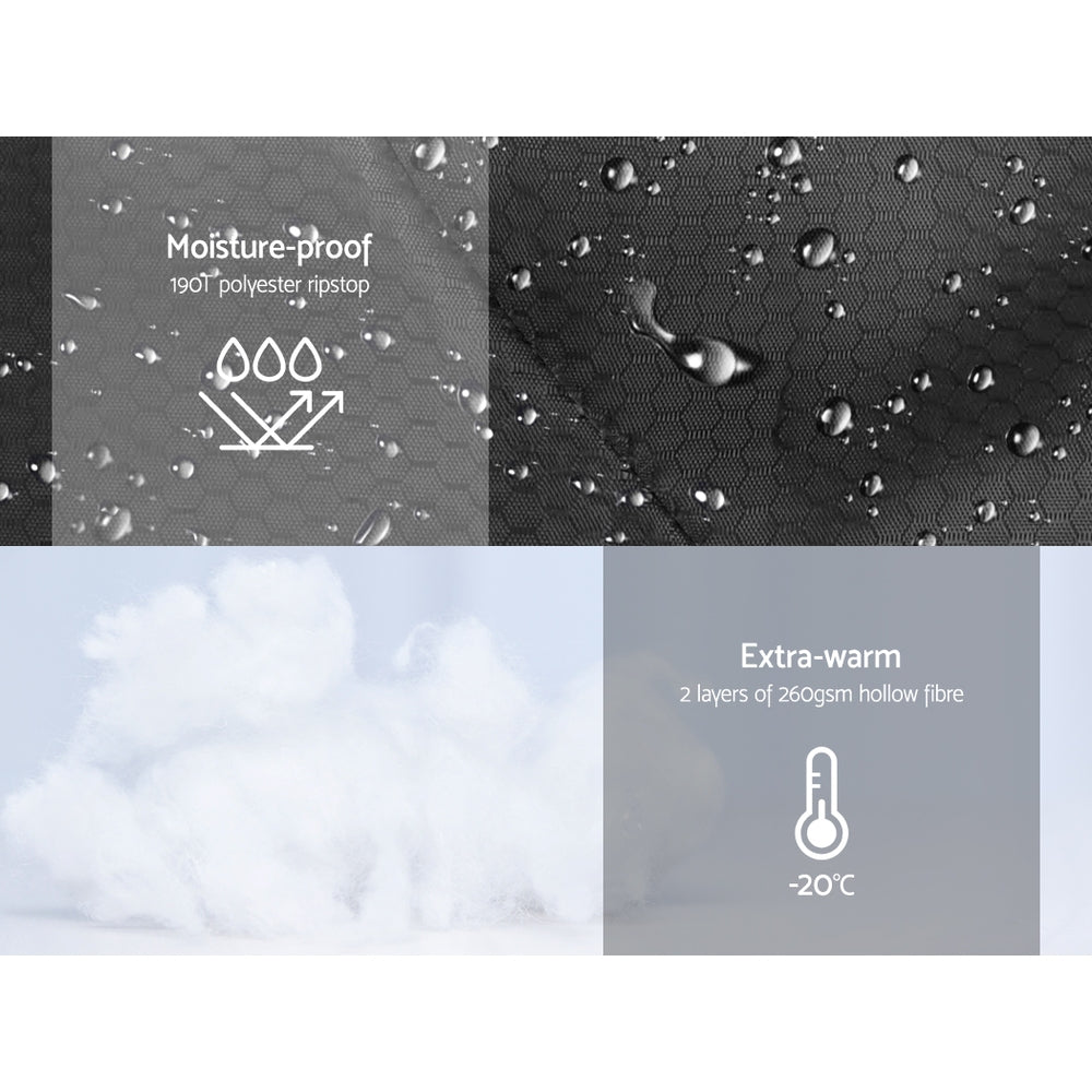 Made with a 190T polyester ripstop outer layer, a 190T polyester pongee inner layer and filled two layers of 260gsm hollow fibre filling, the sleeping bag offers superb warmth that outrivals even your much-loved quilt at home. Soft, breathable and utmost comfort in unforgiving conditions.